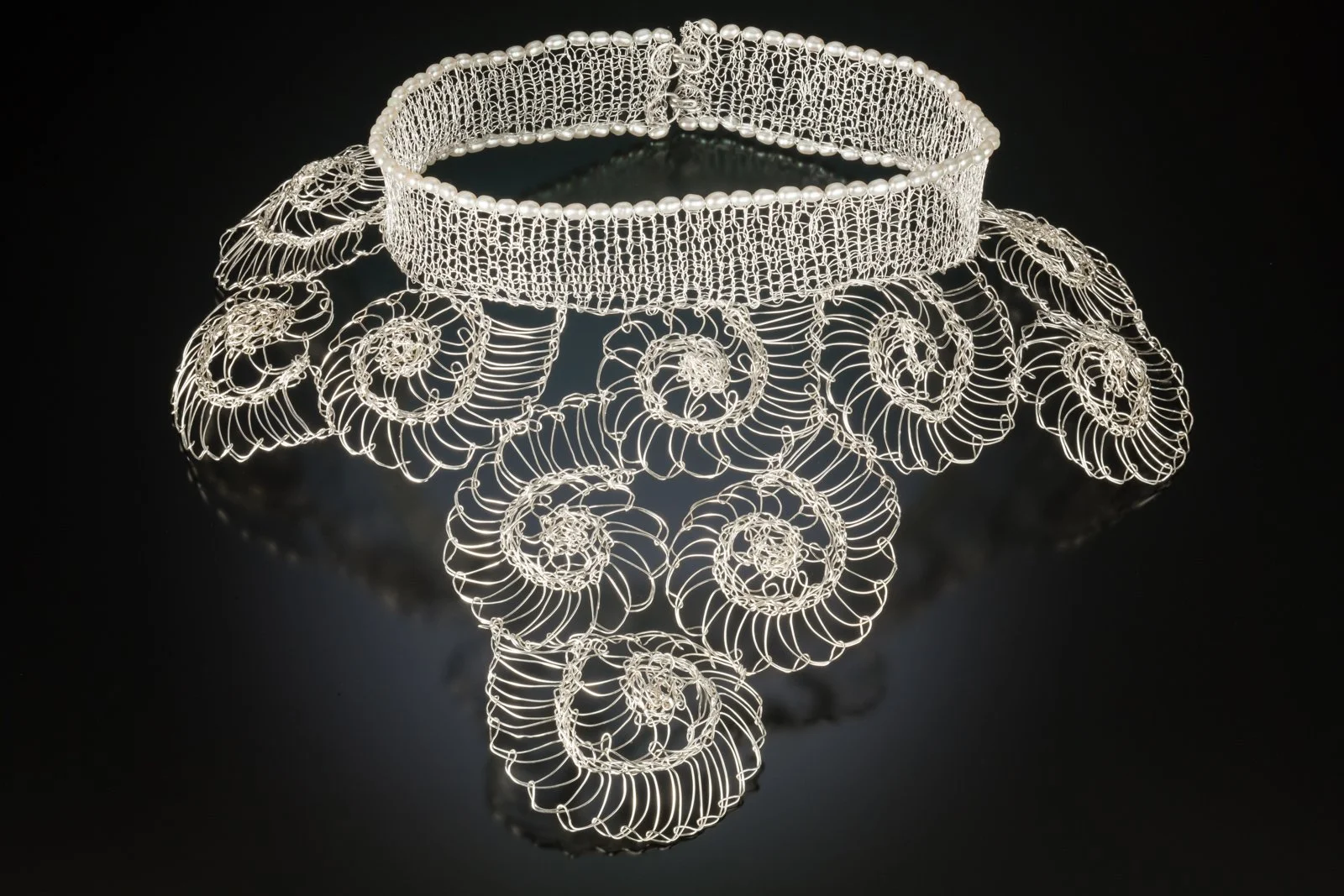 Marla S. Rudnick’s skills of knitting and metal work fused into an exploration of knitting precious metals into wearable art. Her knitting creates a metal fabric which can be formed into sculpture and adornments for the body. She has trained at Fleischer Art Memorial in Philadelphia, Creative Arts Workshop in New Haven, CT, Philadelphia College of Art and The Craft Alliance in Saint Louis, MO. Marla received an Honorable Mention in 2007 for her collar Petals and a Guild Award in 2009 for her necklace Transition from the Creative Craft Council of Washington, DC. She won a Jurors Recognition for her necklace Spiral from the Washington Guild of Goldsmiths Biennial Exhibition Metalwork 2015,